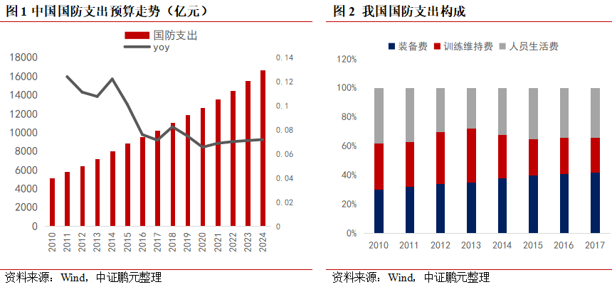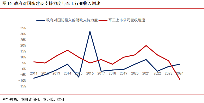政府對國防建設支持力度與軍工行業(yè)收入增速在大多數時(shí)間內保持同向變化,我國持續加大國防和軍隊建設支持力度,且有望持續維持在較高水平。軍費增速與公共財政支出增速的差值,可反映出我國政府對國防建設的支持力度,即財政支出增速與軍費投入增速的差值越大,則說(shuō)明國防建設投入力度越大。 值得注意的是,2023-2024年軍工行業(yè)收入增速與政府對國防建設支持力度出現的明顯背離,或與軍工行業(yè)政策調整與改革深化的相關(guān)年份,導致部分資金自需求側向供給側的傳導過(guò)程中產(chǎn)生了一定的時(shí)間延遲所致,考慮到五年規劃的計劃性,這部分資金或將延期兌付至“十四五”末期以及“十五五”初期。我國持續加大國防和軍隊建設支持力度。2024年我國軍費增速7.2%,繼續位于2020年以來(lái)高點(diǎn)。我國國防支持力度(軍費增速與公共財政支出差值)持續加大,2022-2024年分別為-1.3%、1.8%、3.4%。政府對國防投入的財政支持力度持續加大,且有望維持在較高水平。