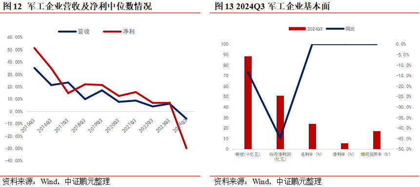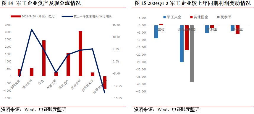 2024年軍工行業(yè)仍然處于“弱現實(shí)”階段。2024年前三季度,核心軍工企業(yè)營(yíng)業(yè)收入增速中位數近十年首現負值,歸母凈利潤增速中位數降至-29.92%,企業(yè)經(jīng)營(yíng)壓力較大。因新訂單下發(fā)延遲,合同負債回落較多:2024年第三季度,軍工行業(yè)整體合同負債為479億元,較年初下降37.0%,較上一季度末下降6.2%。這主要是由于新訂單的下發(fā)出現了延遲,導致原本的合同負債在逐步結轉為收入。此外,在資產(chǎn)負債表中,反映短期需求的合同負債和預收款項的同比增長(cháng)速度也持續下滑。這些財務(wù)指標的下降表明,軍工板塊在2024年延續了自2022年以來(lái)的“弱現實(shí)”趨勢。軍工行業(yè)通常在年內集中回款,2024年前三季度整體經(jīng)營(yíng)性?xún)衄F金流為-869億元,相較于去年同期的-997億元有所改善,回款情況呈現出積極的變化。第三季度的經(jīng)營(yíng)性?xún)衄F金流為-287億元,需要關(guān)注第四季度的回款情況。