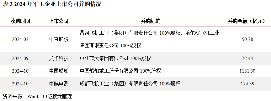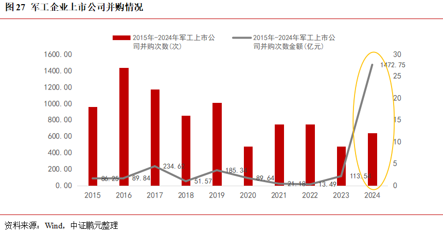 在軍工央企追求高質(zhì)量發(fā)展以及新質(zhì)生產(chǎn)力蓬勃發(fā)展的大趨勢下,2024年軍工行業(yè)迎來(lái)了并購潮。2024年軍工行業(yè)的并購次數相較于2023年實(shí)現了翻倍增長(cháng),并購金額更是創(chuàng )下了歷史新高。主要原因:其一,源于軍工產(chǎn)業(yè)自身發(fā)展階段的內在需求。歷經(jīng)過(guò)去數年的高速發(fā)展,軍工行業(yè)的產(chǎn)業(yè)成熟度已獲得顯著(zhù)提升。在新一輪國企改革的浪潮中,軍工上市公司肩負著(zhù)做大做強做優(yōu)以及進(jìn)行市值管理的重要使命,而并購已成為軍工央企在資本運作方面的關(guān)鍵手段之一,這對于優(yōu)化產(chǎn)業(yè)結構、提升產(chǎn)業(yè)集中度以及增強軍工企業(yè)的核心競爭力具有至關(guān)重要的作用,進(jìn)而能夠更好地滿(mǎn)足國防現代化建設的戰略需求。其二,受到IPO階段性放緩的影響。自2023年起,IPO節奏出現階段性放緩,致使企業(yè)上市所需的時(shí)間大幅延長(cháng)。在這種情況下,眾多企業(yè)為實(shí)現資產(chǎn)證券化,紛紛將并購作為一種可行的替代路徑,從而推動(dòng)了軍工行業(yè)并購潮的出現。其三,軍工股權投資機構面臨集中退出的需求。自 2019年之后,軍工領(lǐng)域的股權投資活動(dòng)異?;钴S,時(shí)至當下,這些軍工股權投資機構普遍面臨著(zhù)退出的需求。而并購則為其提供了實(shí)現項目退出的重要途徑,通過(guò)將所投資的軍工企業(yè)出售給上市公司或其他具備實(shí)力的企業(yè),股權投資機構能夠順利實(shí)現資金的回籠以及收益的兌現,這在一定程度上也促使了軍工行業(yè)并購潮的形成。此外,由于軍工產(chǎn)業(yè)鏈條較長(cháng)且集群效應明顯,在新質(zhì)生產(chǎn)力所涉及的諸多領(lǐng)域,尤其是低空軍機、商業(yè)航天、民機等領(lǐng)域,越來(lái)越多的民參軍上市企業(yè)出于對產(chǎn)業(yè)鏈進(jìn)行橫向拓展與縱向延伸的考量,開(kāi)始沿著(zhù)產(chǎn)業(yè)鏈開(kāi)展并購活動(dòng),以此實(shí)現企業(yè)的高質(zhì)量發(fā)展,這也進(jìn)一步助力了軍工行業(yè)并購潮的持續涌動(dòng)。